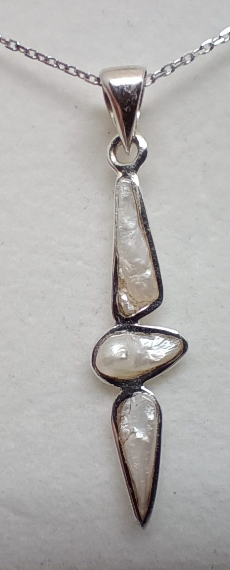 Three pearl pendant containing natural Mississippi River pearls. Set in Sterling silver, includes 18″ chain with lobster claw.