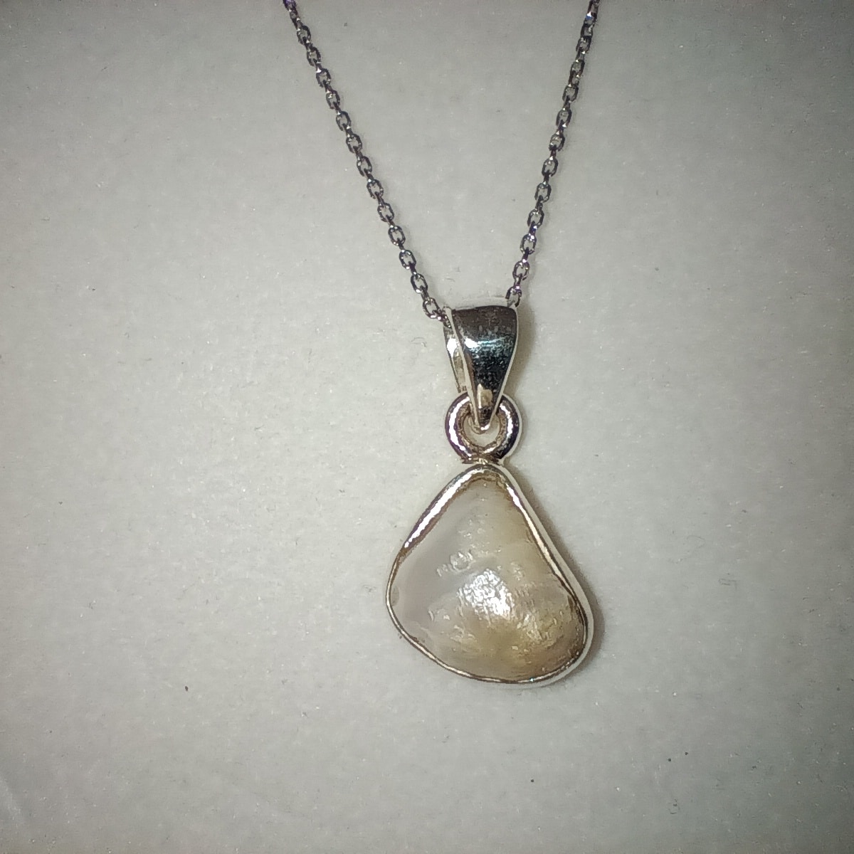 Natural Mississippi River pearl nugget hung on a 18 inch sterling silver chain. Pearl is White with great luster
